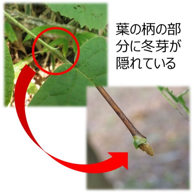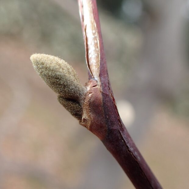 毛がもじゃもじゃの冬芽。 必ず脇に小さな予備芽がついています。