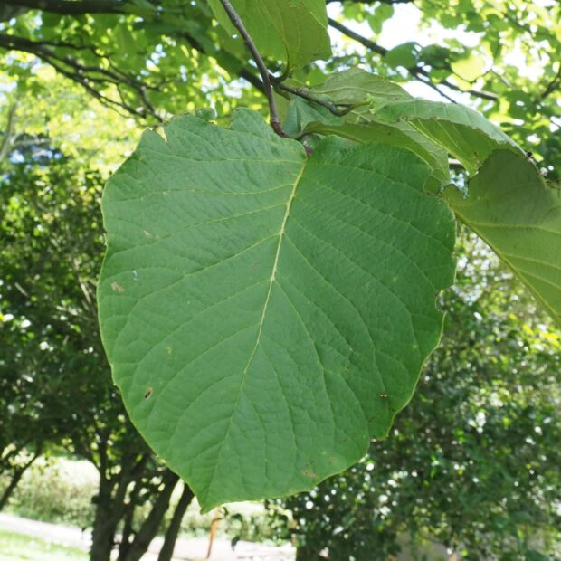 大人の手のひらほどもある大きな円い葉です。 先がツンと少しとがります。 葉の裏には毛が沢山生えていていて白っぽく見えます。