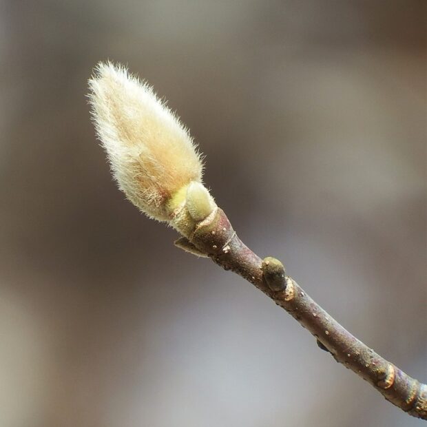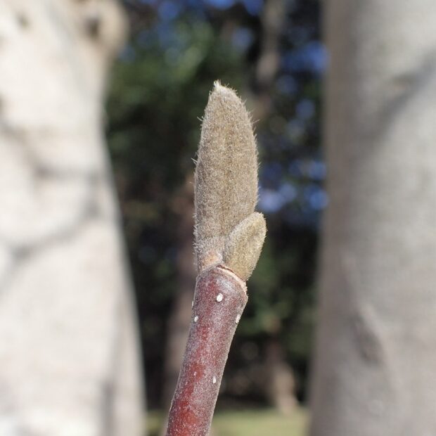 花芽は大きくてふわふわの毛におおわれ、 陽が当たるとキラキラとして目立ちます。 葉芽の毛は少し短く、 大きさも小さい芽です。