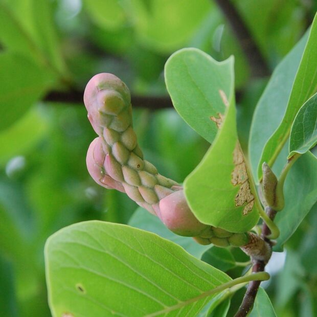 モクレン科は原始的な木で特徴として花の雄蕊(ゆうずい)と雌蕊(しずい)がらせん状に並んでいます。