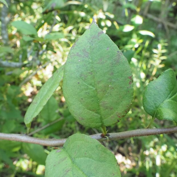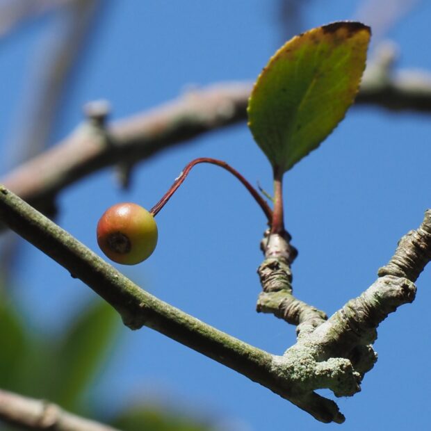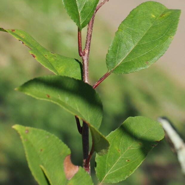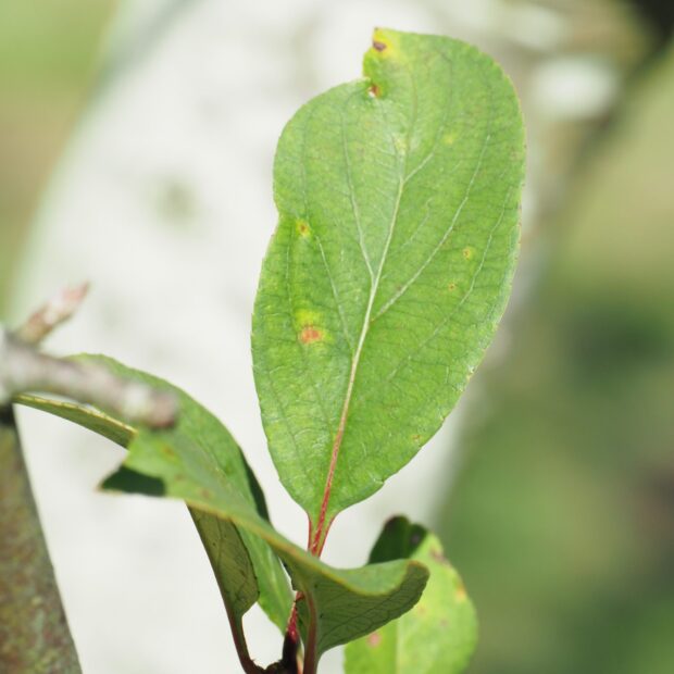 互生。 かための葉っぱになります。 リンゴの仲間の木の中で特に細長く、 浅いギザギザがあります。