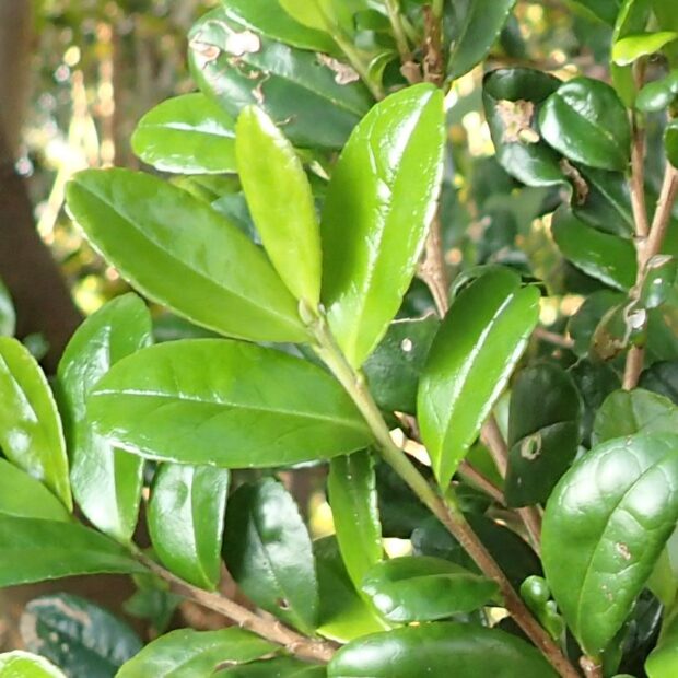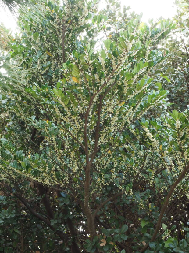 潮風にも日蔭にも比較的強く、 刈込まれても我慢強い木。 サカキやヒサカキが神様にお供えされていても、 ねたむことことはなく、 毎年1回人騒がせな匂いの花を咲かせます。 虫を呼ぶために。