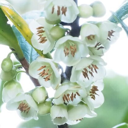 暖地では10~11月頃に淡い黄緑色の花を咲かせます。 鐘のような形でいくつかが纏まって下を向いて咲きます。 可愛らしい見た目ですが、 強い臭いがあります。 ヒサカキと同じ匂いで、 ガス臭、 塩ラーメン、 漬物、 動物園の匂いと言われます。