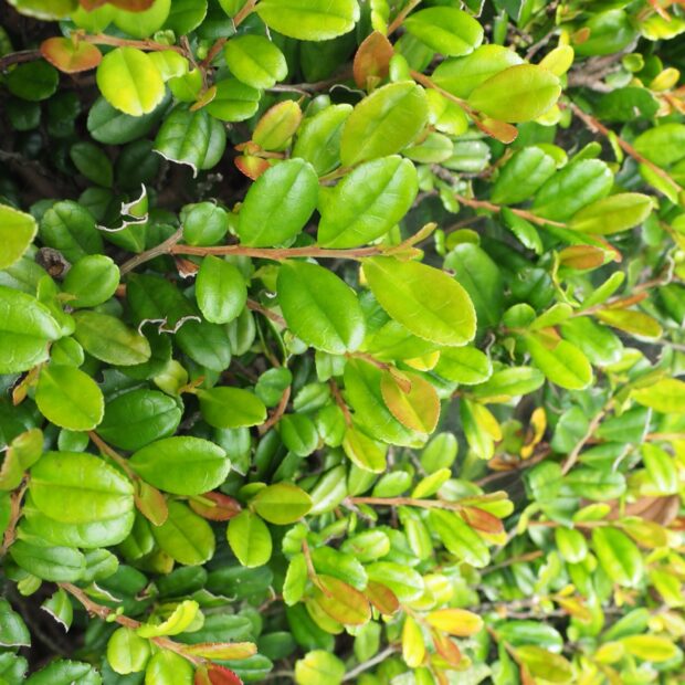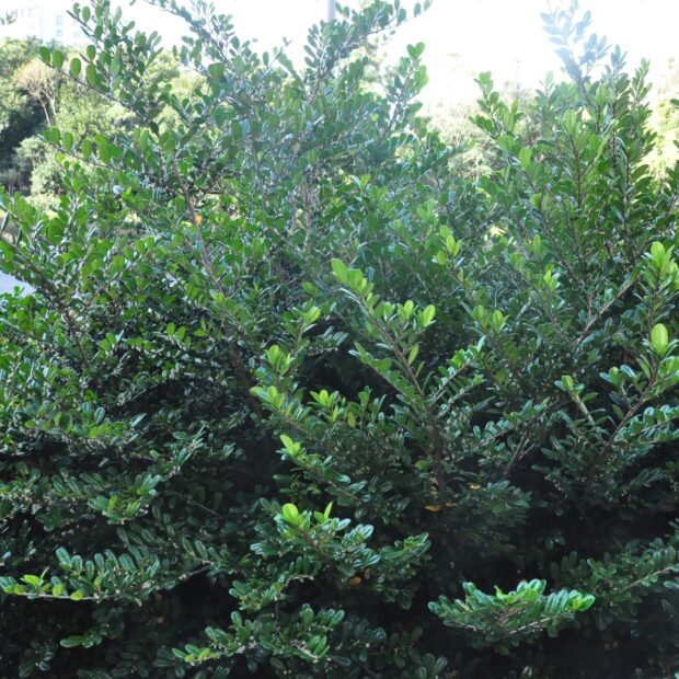 サカキ(榊)と名前はついていますが、 お供えの木としては使われず、 海辺の生垣などとして植えられます。 冬には可愛らしい鐘形の花と実が付きますが、 この花は匂いがいろいろな誤解や波紋を生みます。