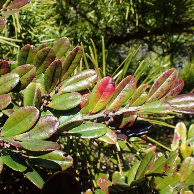 舌のような形の小さな葉(2-4cm)でふちはギザギザとしています。 葉の表面は反り返り、 光沢があり革のような感触です。 毛はありません。