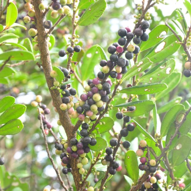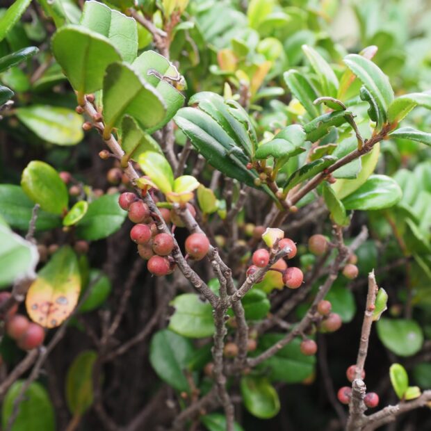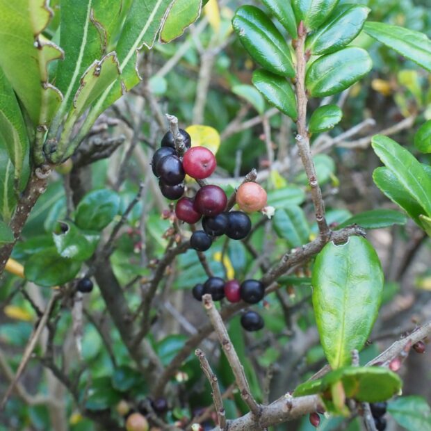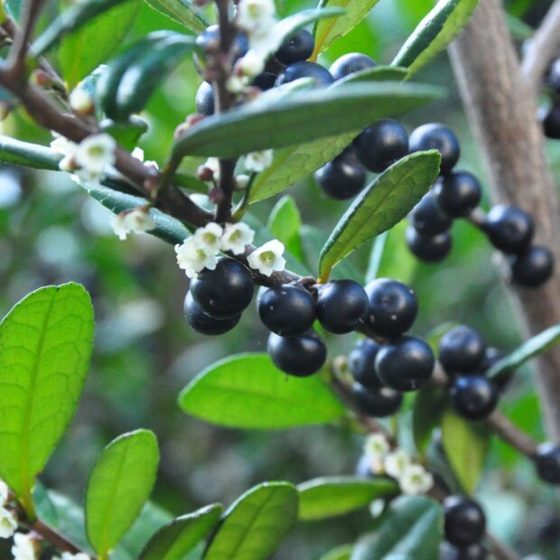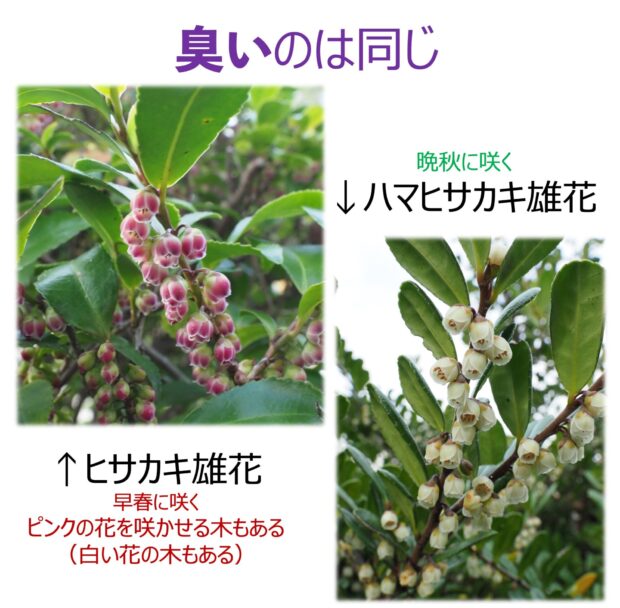 花が咲く晩秋、 匂いを頼りにハマヒサカキを探してみましょう。 花の中もよく見て、 雄の木か雌の木か確かめてみましょう。
