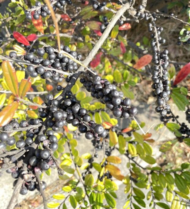 11月~12月頃に黒紫色にピカピカの実がなります。 中には沢山の小さな種が入っています。