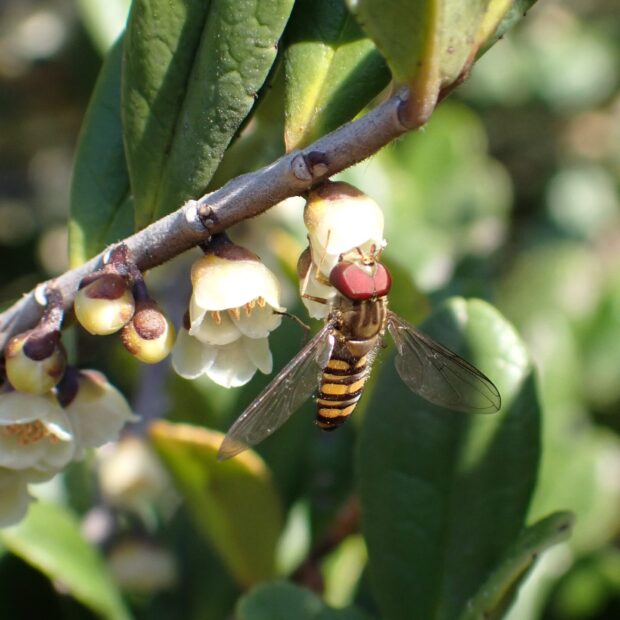 花が咲く晩秋、 匂いを頼りにハマヒサカキを探してみましょう。 花の中もよく見て、 雄の木か雌の木か確かめてみましょう。
