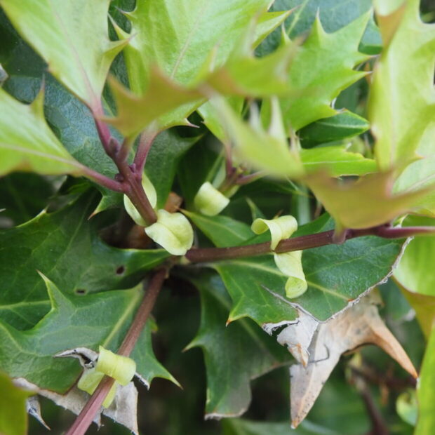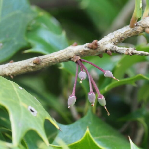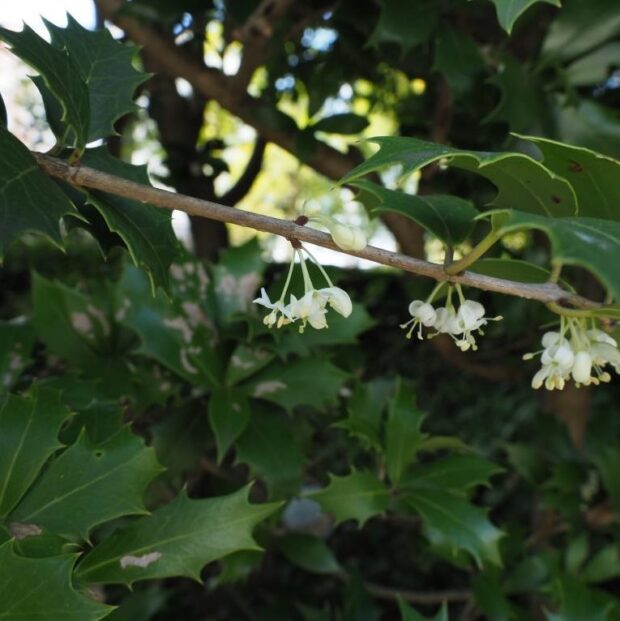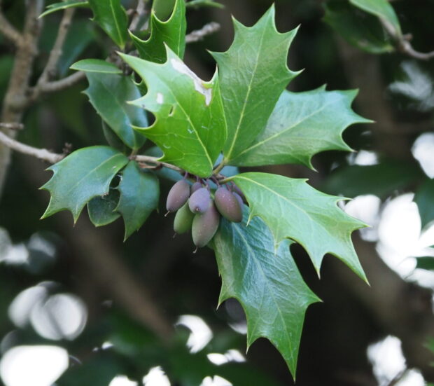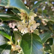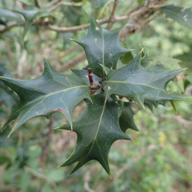 ヒイラギの硬くて棘だらけの葉は、 節分飾りに使われます。 この葉の棘(とげ)が厄を追い払う役割をすると考えられています。