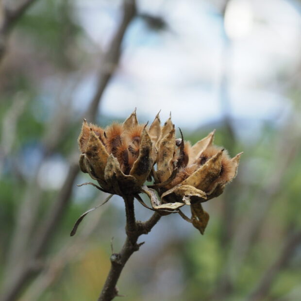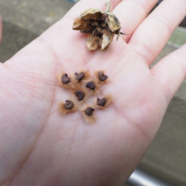 実が熟すと割れて、 中から毛のはえたライオン丸のような種が出てきます。 八重咲きの花はめしべやおしべが花びらになるので、 あまり実りません。