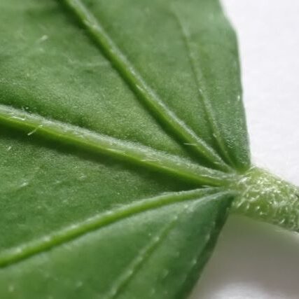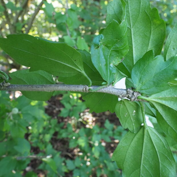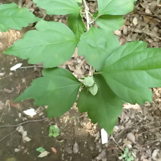 葉の長さは4-10cmで、 ざっくりひし形で、 切れ込みの深い葉です。 葉表も葉裏のように葉脈が出っ張ります。 葉は交互につきます。