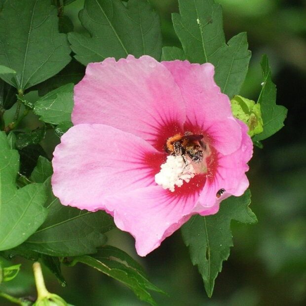 奈良時代に渡来したムクゲの漢名が木槿で、 「モッキン」から「ムクゲ」になまったと言われています。 韓国語でムグンファと呼ばれるので、 韓国語の影響があったとも言われています。