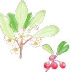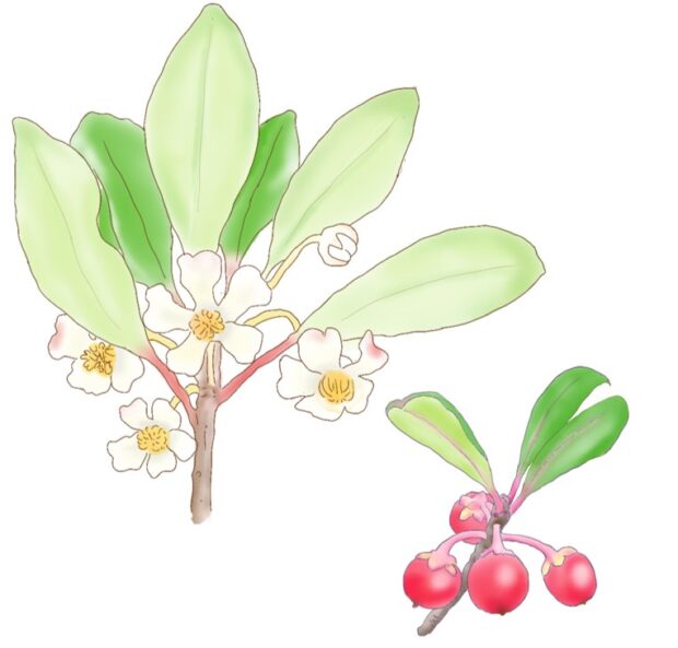 真夏に咲く白い花は強い香りがして遠くにいても分かります。 秋に実は真っ赤で小さなリンゴのようです。