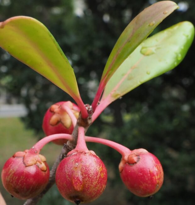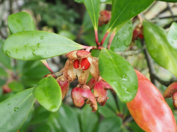 小さなリンゴのような赤い実がなります。 割れると中から赤い種が出てきます。