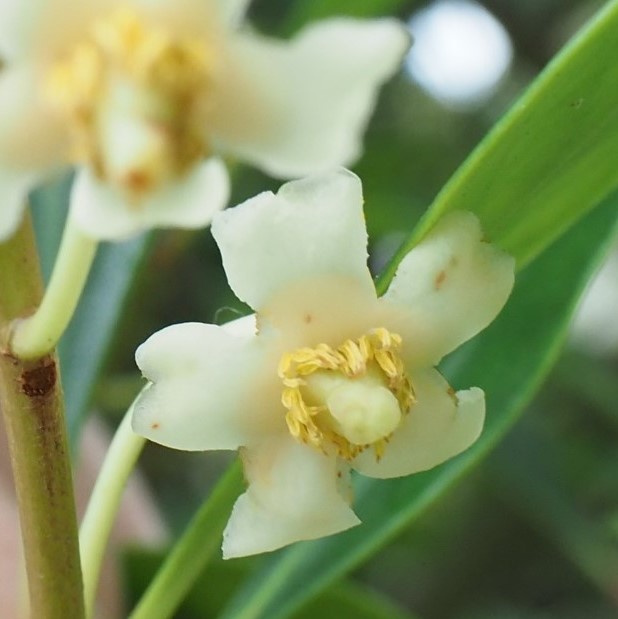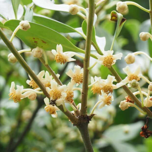 白い花は強い香りがします。 花は下向きに咲きます。 両性花が咲く木と雄花が咲く木があります。