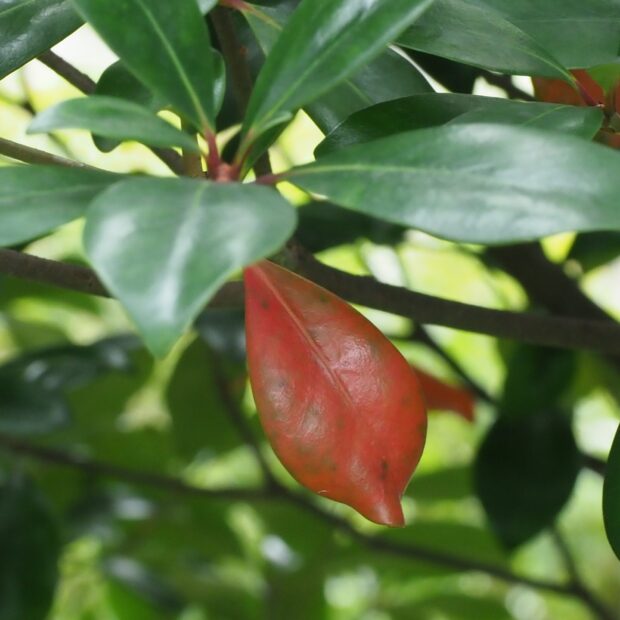 葉が数枚つづられ茶色になっているのは、 モッコクの葉を食べるモッコクヒメハマキ(モッコクハマキ)という小さなガの幼虫のしわざです。