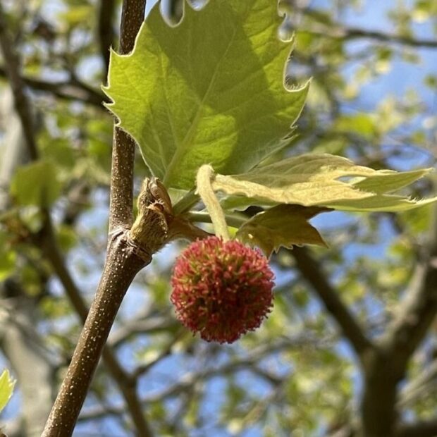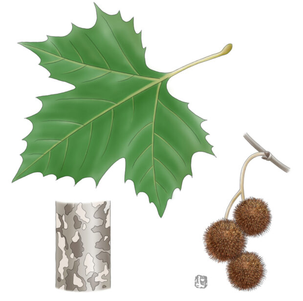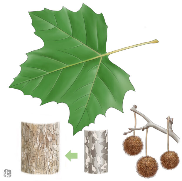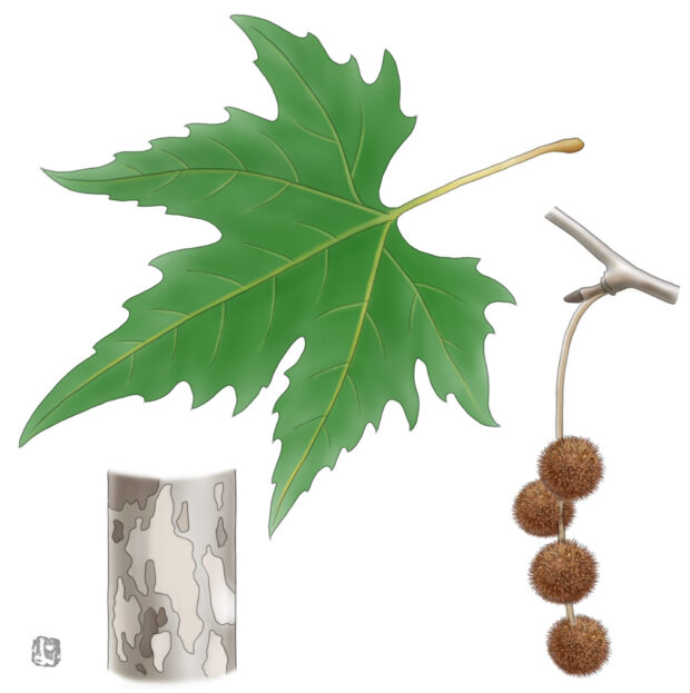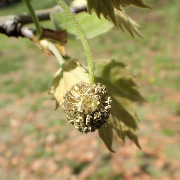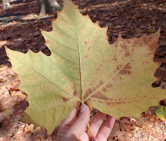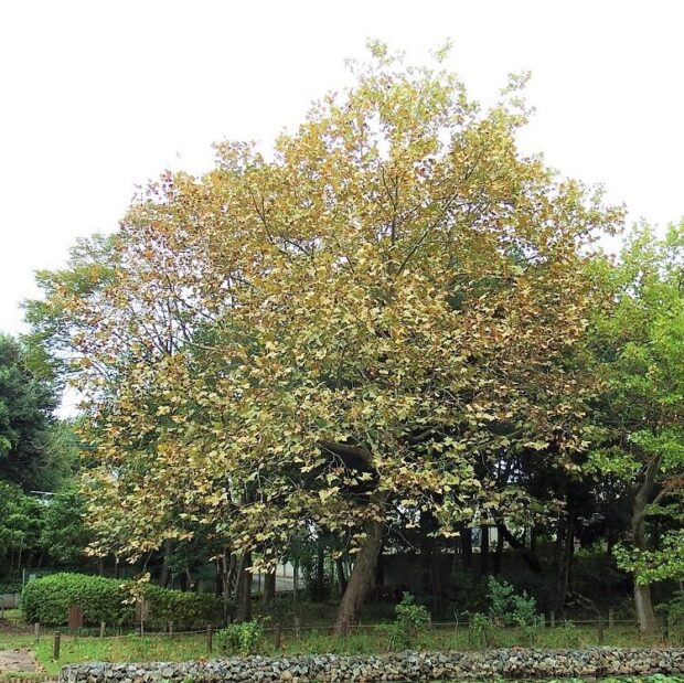 北アメリカ原産のスズカケノキです。 プラタナスとも呼ばれます。 日当たりのよい場所が好きで、 広い場所ではとても大きくなります。 近い仲間のモミジバスズカケノキもよく植えられています。