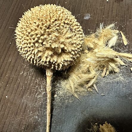 花は雌雄別々でどちらも応援団のポンポンのよう。 赤いほうが雌花です。