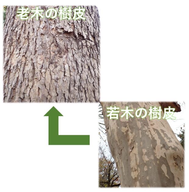 老木になると幹の成長が遅く樹皮がはがれにくくなり、 褐色のものが多いです。