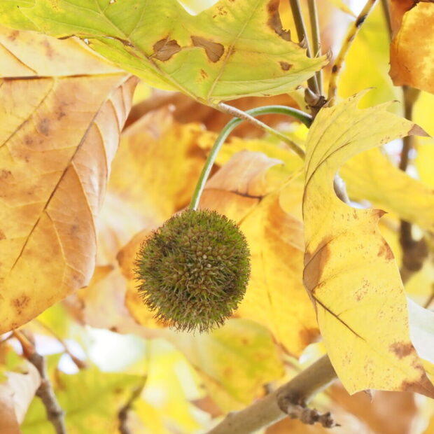 プラタナスと呼ばれる木は日本に三種類あります。 実の数と葉の切れ込みでみわけます。