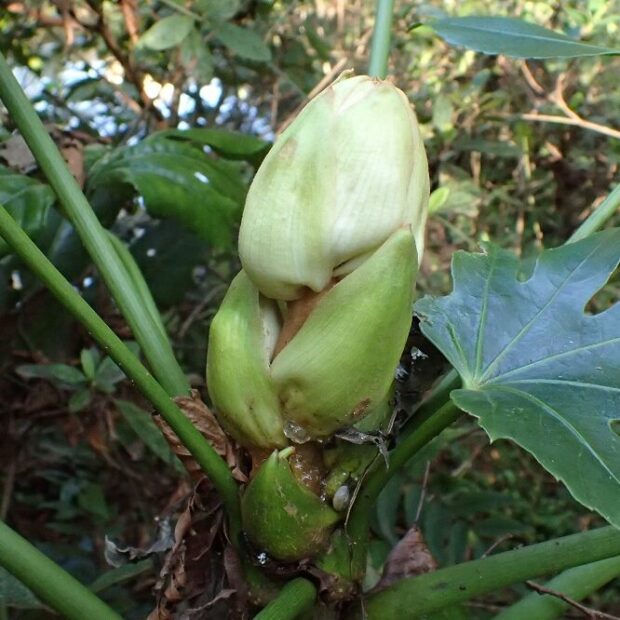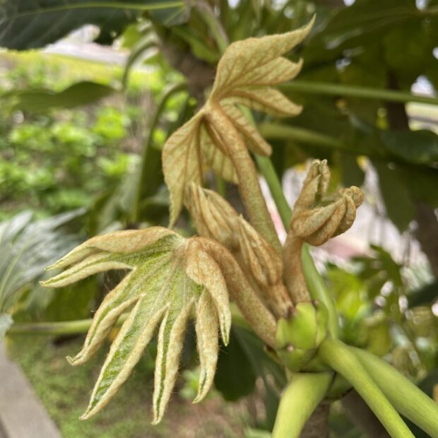 高さ1.5~3mくらいになります。 中には5mくらいまで大きくなる木もあります。 枝はあまり分かれることはありませんが、 大きな葉っぱが目立つので遠くからでも見分けられます。