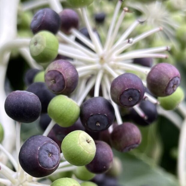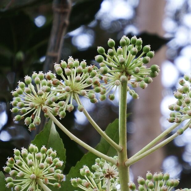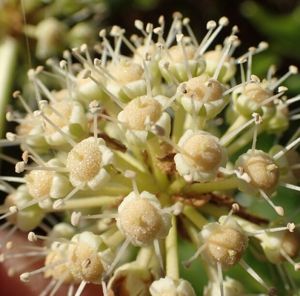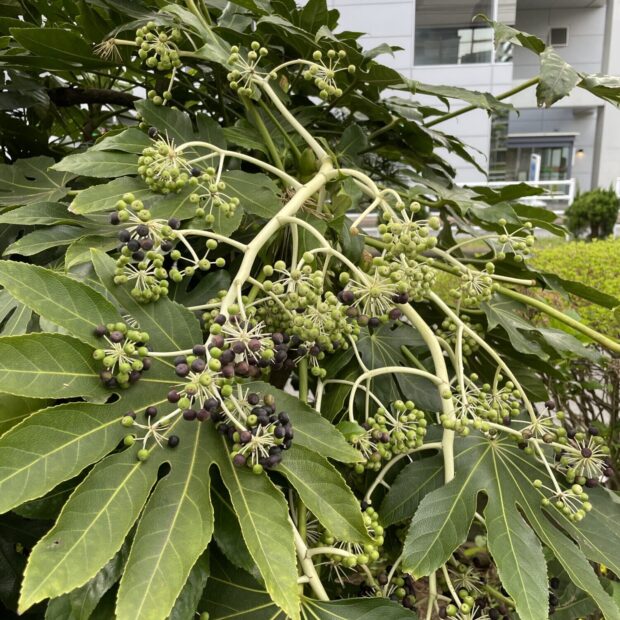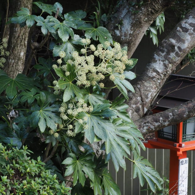 手のひら状に八つに分かれるから八手(=ヤツデ)?と思われがちですが、 実際には切れ目の数は様々で、 7つや9つのように奇数に分かれていることが多いです。 寒い季節に咲く花は、 成虫で冬を過ごす生き物の数少ないレストランです。