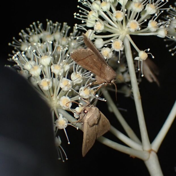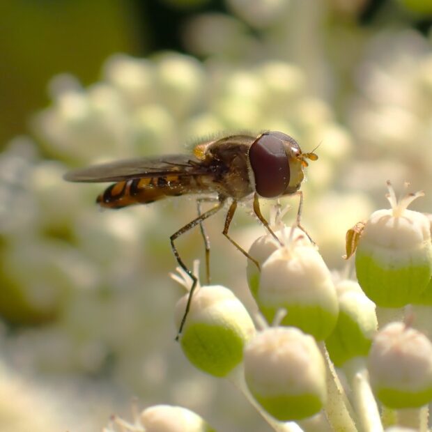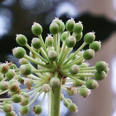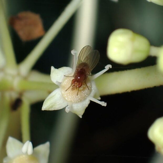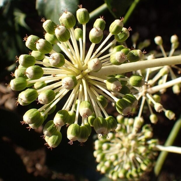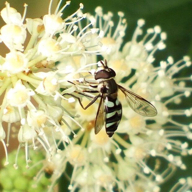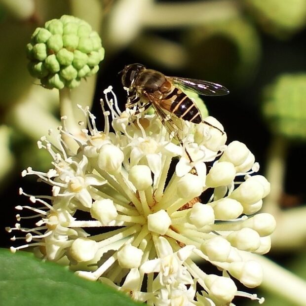 ヤツデの花は、 蜜がたっぷりあり、 虫たちのレストラン。 寒さに強いハエやハナアブなどがたくさん集まります。 スズメバチもやって来ますのでご注意を!