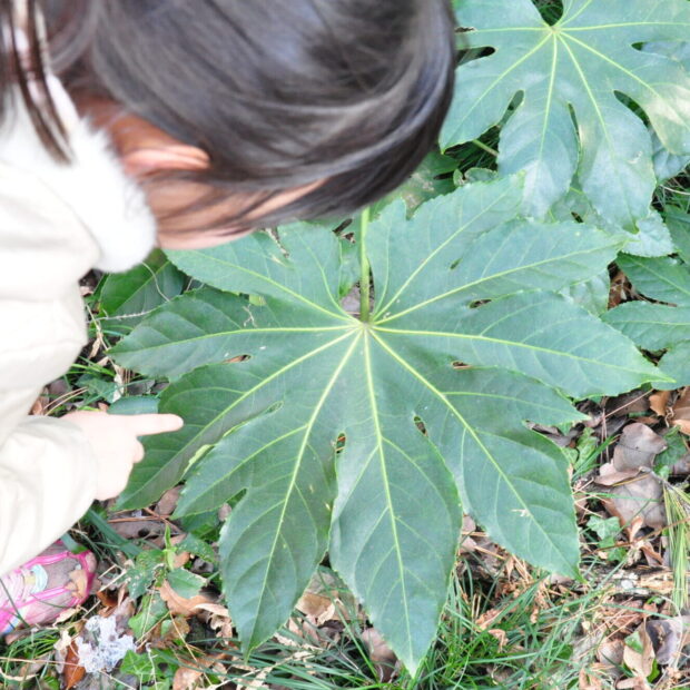 冬、 大きな葉の裏は小さな虫たちの越冬場所になります。 そっとめくって、 隠れている虫たちを探してみましょう。