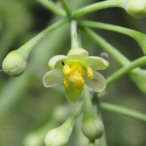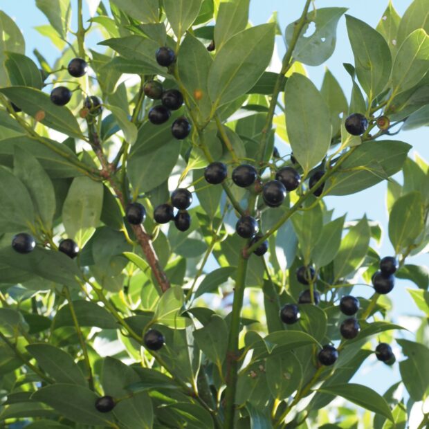 香りのいい花には虫たちが、 黒い実には鳥たちが集まって来ます。 枝先に、 菌類が土の塊のようなゴールを作りますが、 あまり見ることはありません。