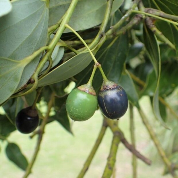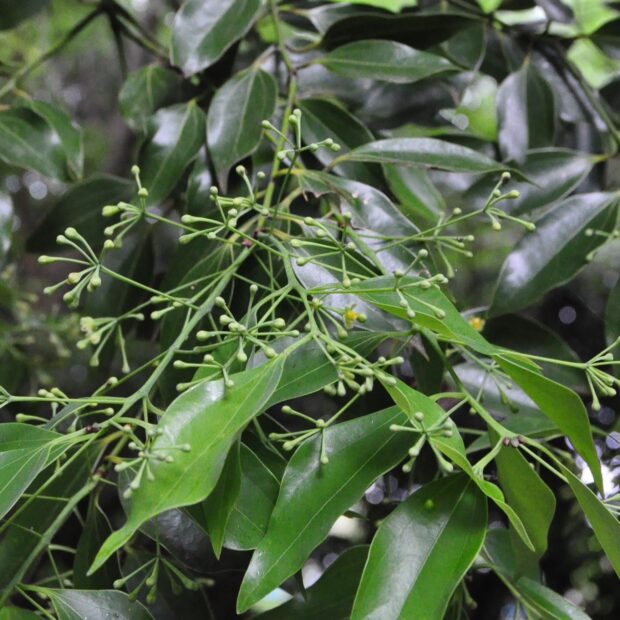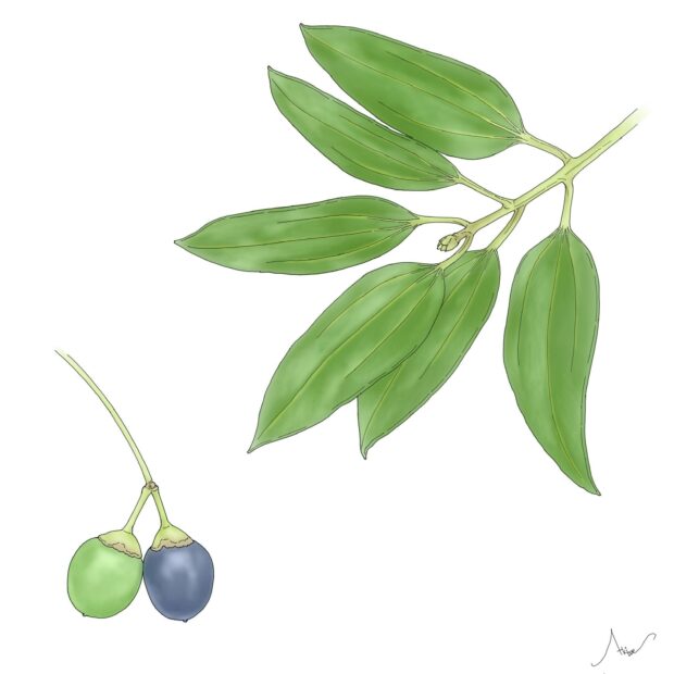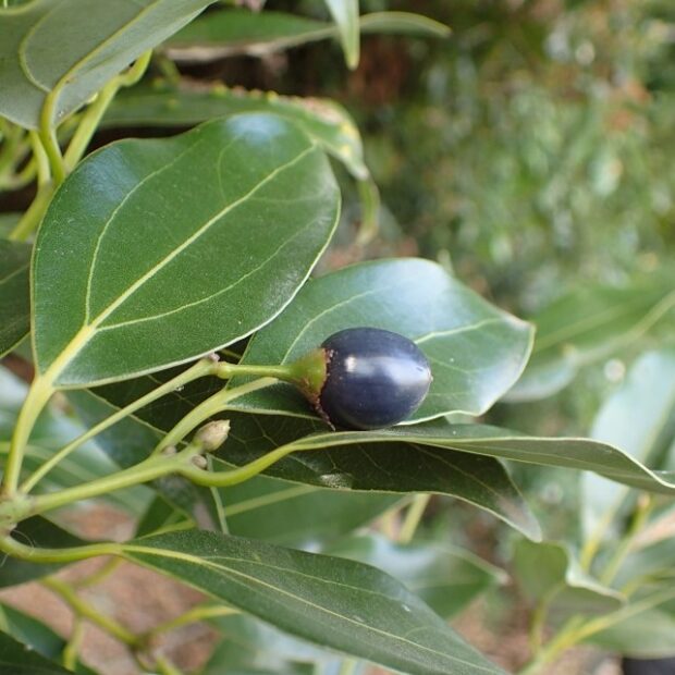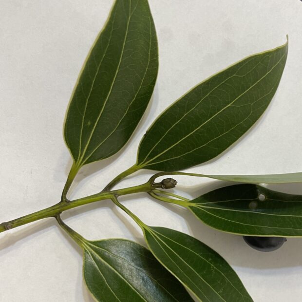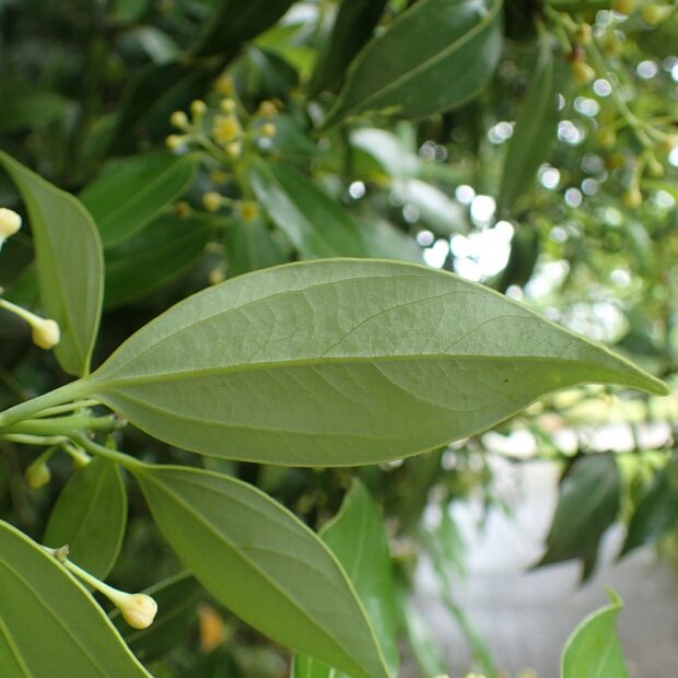葉っぱには三本に分かれる葉脈があり、 ちぎるとシナモンの香りがします。 ニッケイよりも香りが強くないので香辛料には用いられませんが、 種子からは香油がとれ、 葉や樹皮は薬用になります。