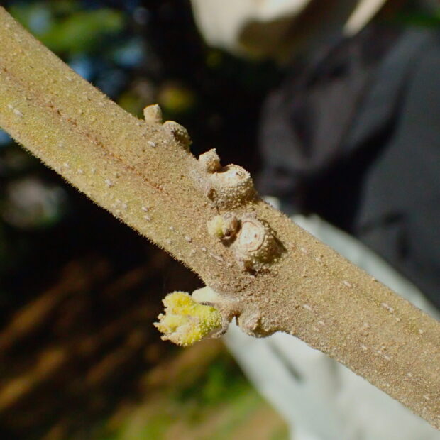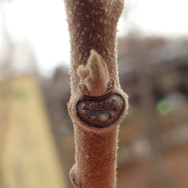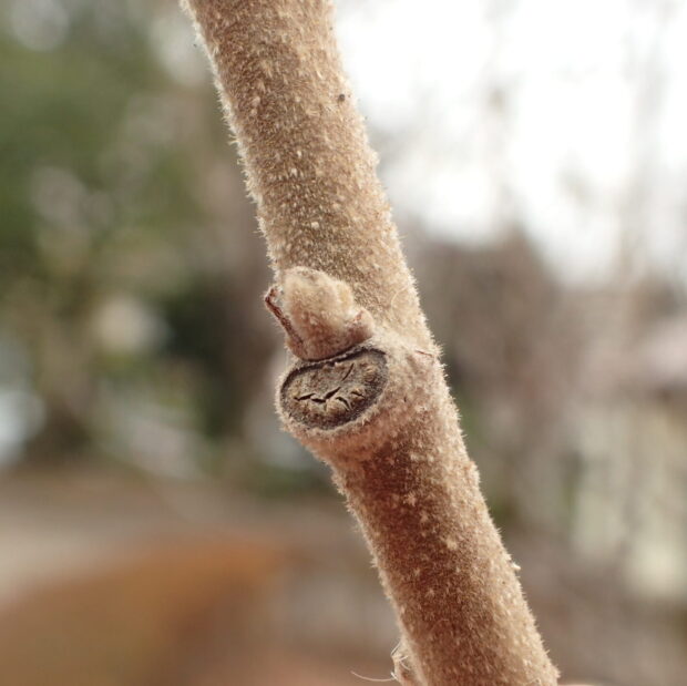 薄茶色の細かい毛がたくさんあり、 芽鱗はありません。 丸みのカーブがきれいな葉痕の維管束痕は、 ぐるりと円形に並んでいます。