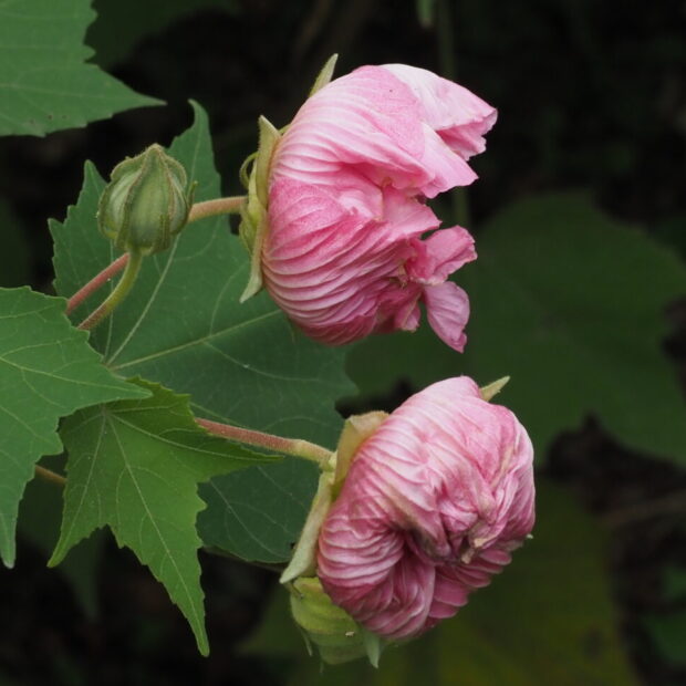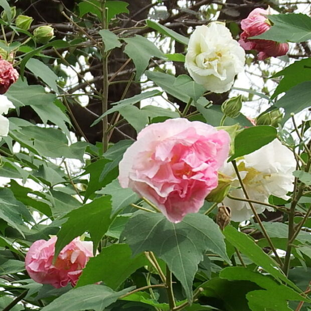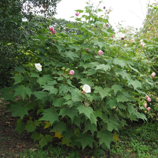 フヨウの八重咲きの品種です。 漢字で「酔芙蓉」と書き、 お酒を飲んで顔が赤くなっていくかのごとく、 花の色が白から淡い紅色に変わります。