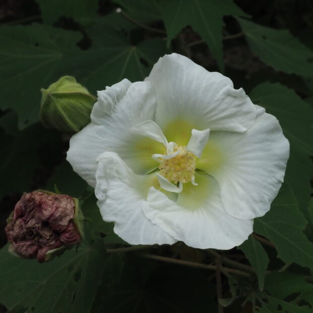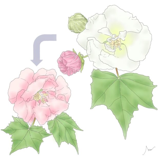 フヨウはほとんど色が変わりませんが、 スイフヨウの花は朝は白色で午後は淡い紅色になります。