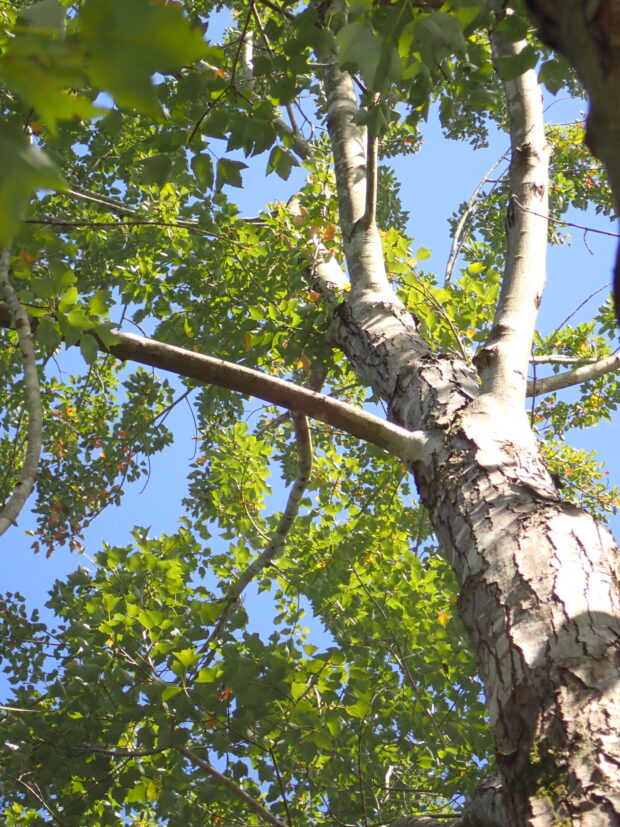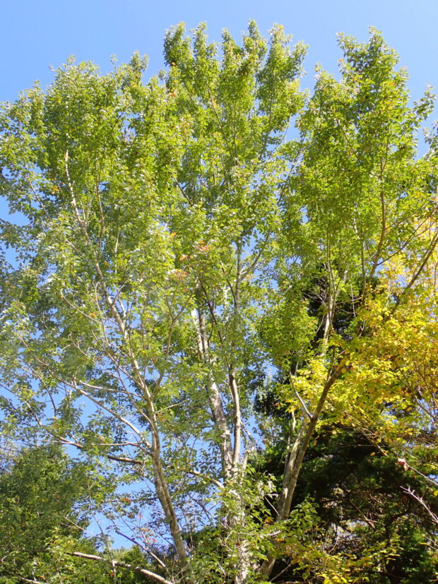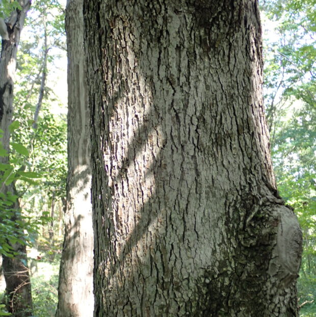 白っぽく縦に裂け目の入った樹皮