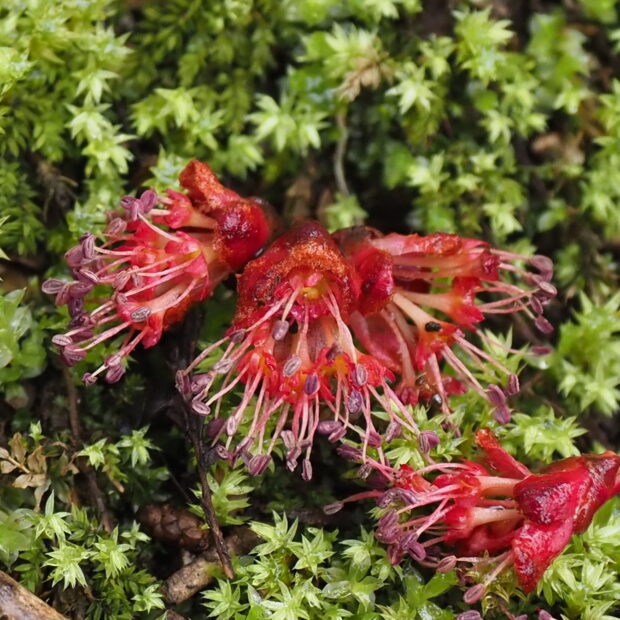 雌雄異株。 花柄に毛が密生。 雌花は1〜3個、 小花が3〜5個集まって咲きます。