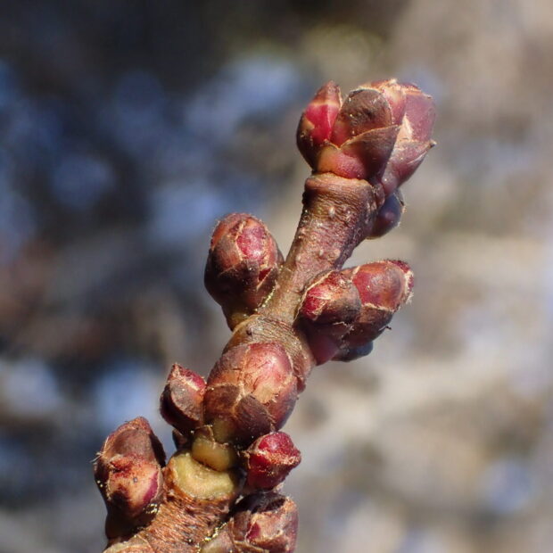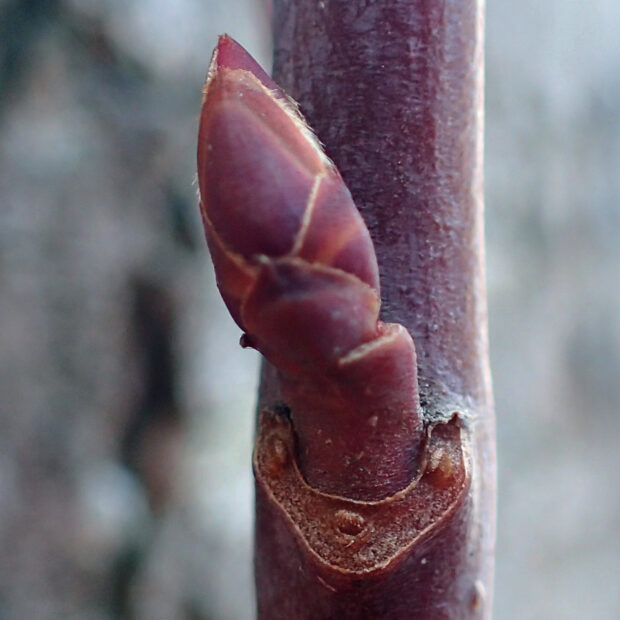赤みの強い色の冬芽です。 カエデの仲間で、 V字型の葉痕にはお顔があります。