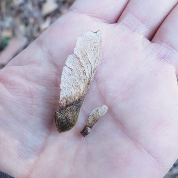 種は、 他のカエデの仲間の種より大柄で毛むくじゃら。 どんなふうに飛ぶか、 飛ばしてみましょう!