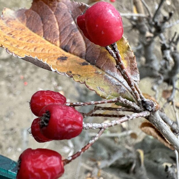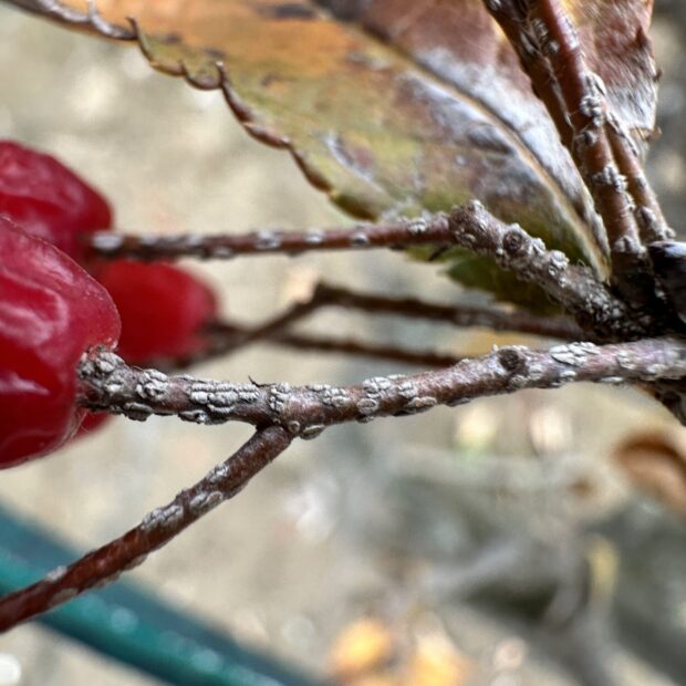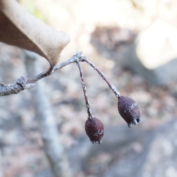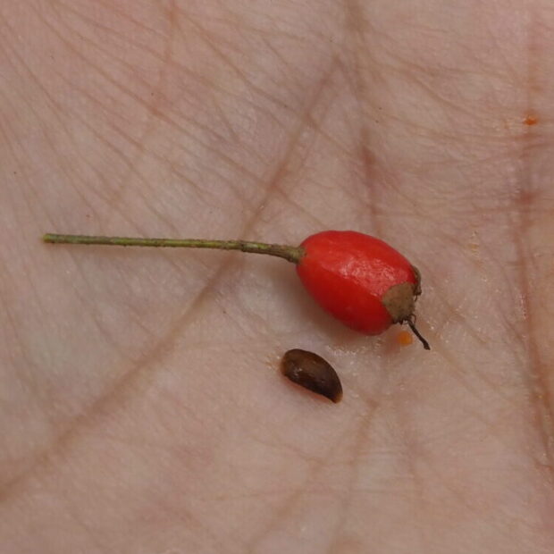 小さな赤い実が秋~晩秋に熟します。 実の柄には不思議な白いイボイボがついていて、 これは皮目(ひもく)といって空気を取り込む役割をしています。