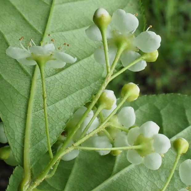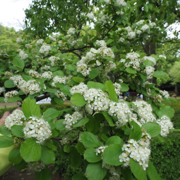 春~晩春に白い小さな花を咲かせます。 花びらは5枚、 直径1㎝ほどの花が10~20個ほど集まって咲きます。