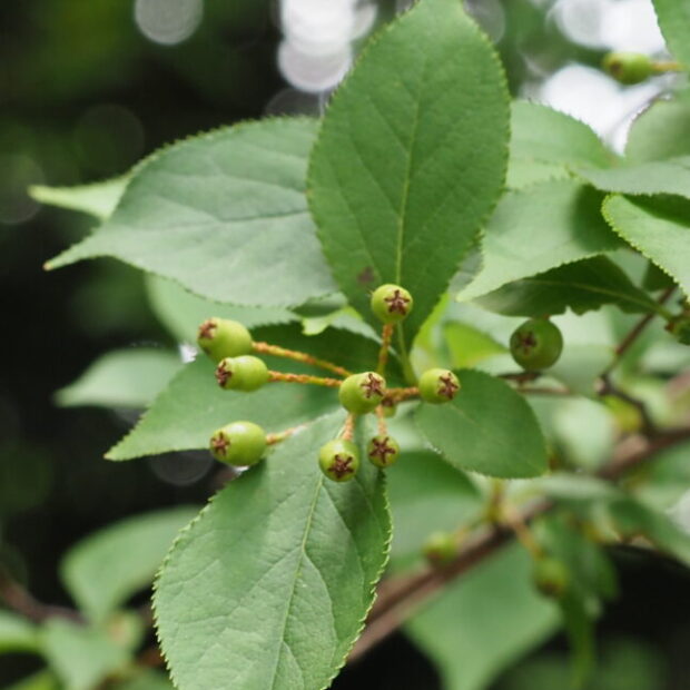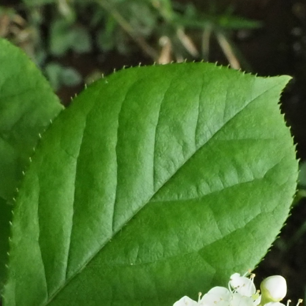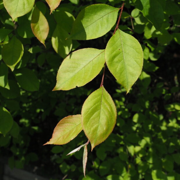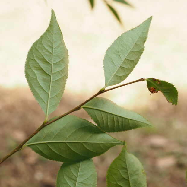 葉は細かいギザギザがあり、 交互に並びますが、 短い枝に集まって付くこともあります。