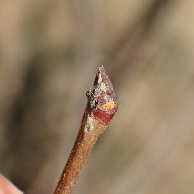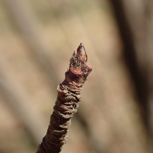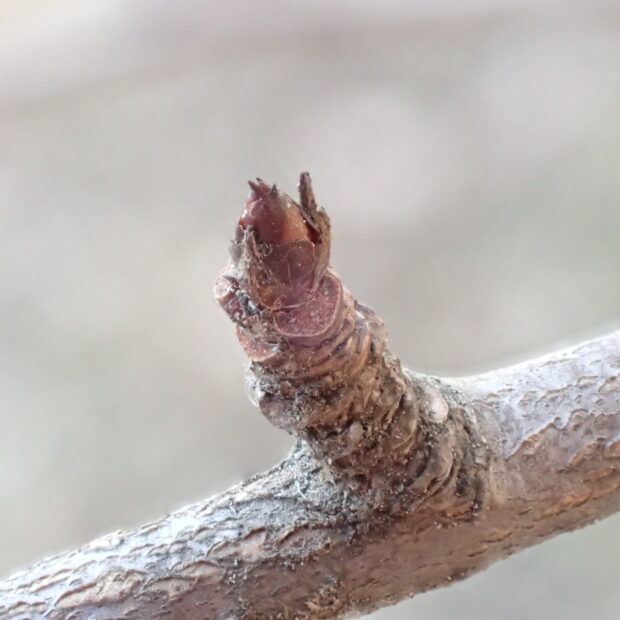 先がとがり、 小さくて赤褐色の芽です。 この色と、 葉痕がぎゅぎゅっと集まった短枝が目印。 茶色っぽい葉痕の維管束痕は3つなので、 ルーペでよく見ると小さなお顔が見えます。
