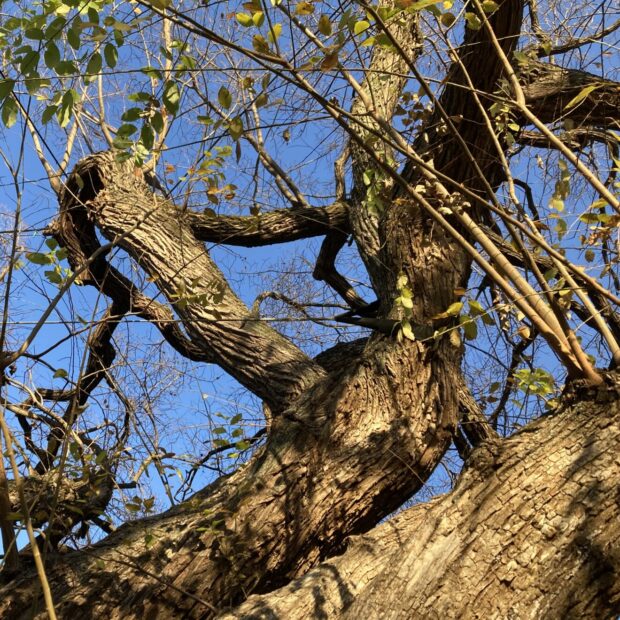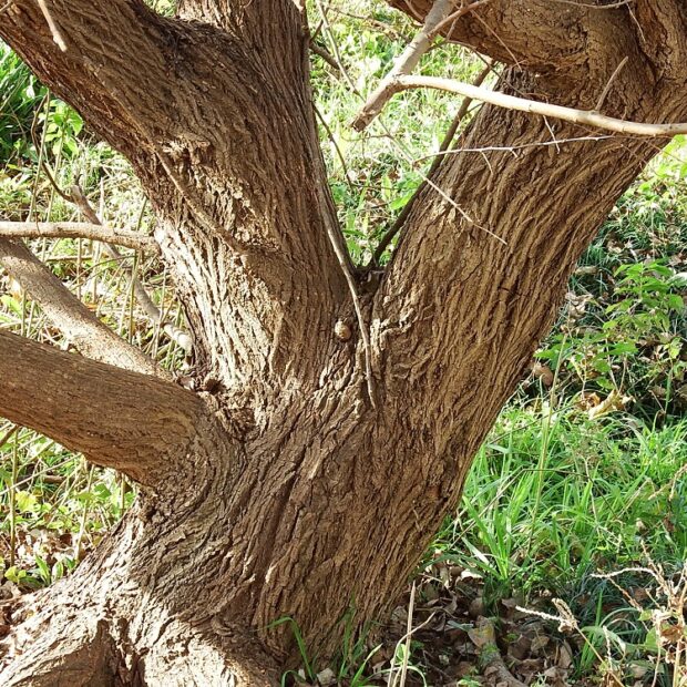 灰色がかった茶色で、 樹皮は縦に深く裂けます。