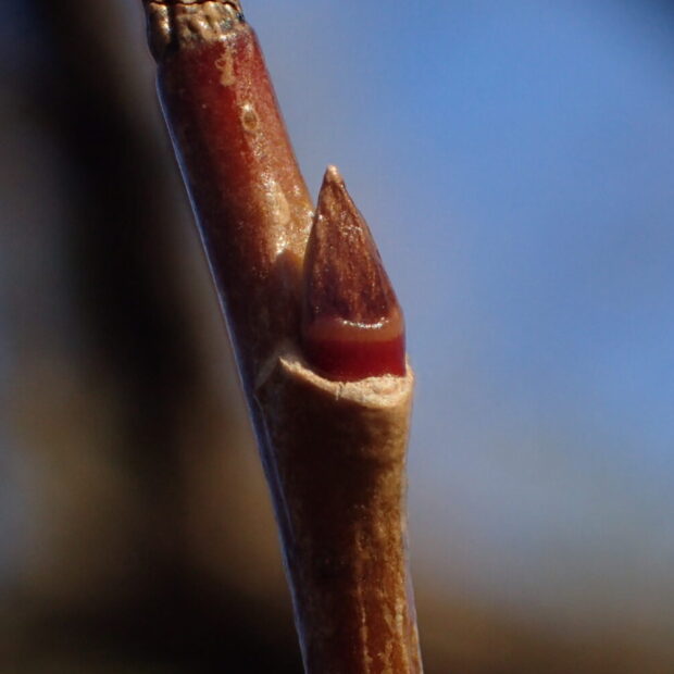 枝から少し飛び出すようにつく、 つやのあるとがった芽です。 赤みのある芽鱗は3枚あるのが特徴です。 (他のヤナギの仲間は、 すっぽりとかぶる帽子のようになっていて継ぎ目がありません。 )V字の葉痕には、 にっこりと微笑むお顔を見ることができます。