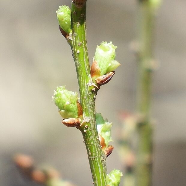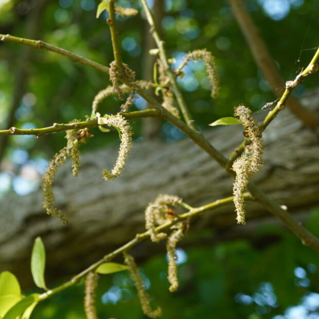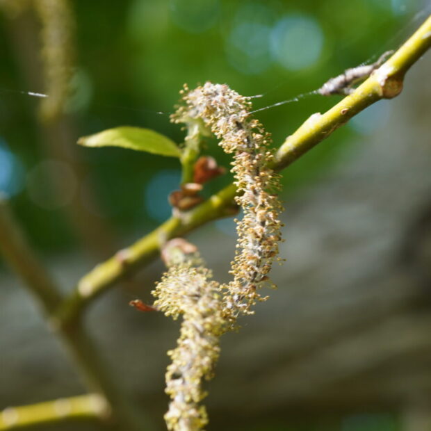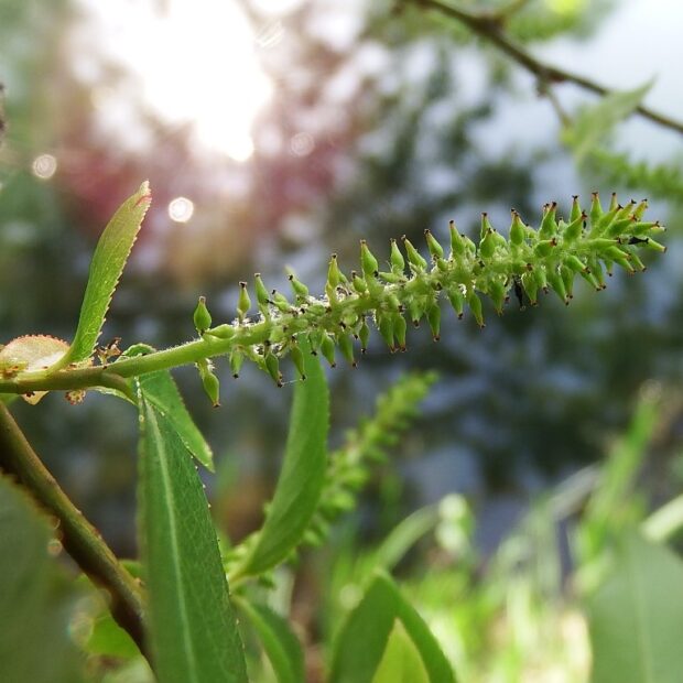 若葉が芽吹いた後の晩春のころ、 紐のような雄花と雌花が別々の木に咲きます。 日本にいるヤナギの仲間の中では最も花の咲く時期が遅いといわれています。
