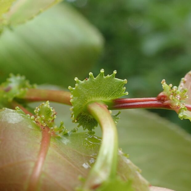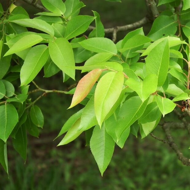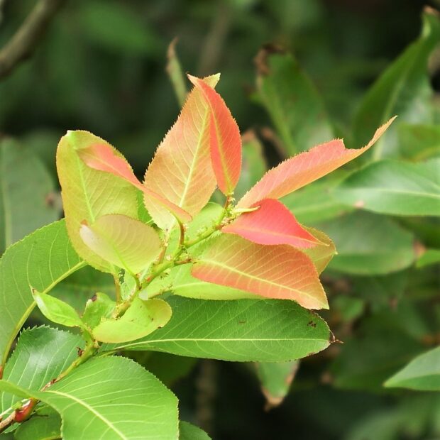 新葉は赤くなります。 細かいギザギザがあり互生です。