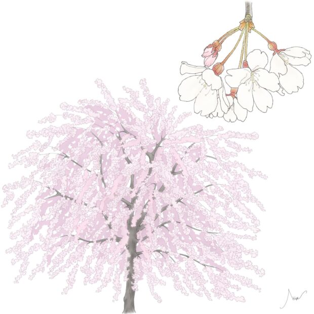 シダレザクラは、 桜の中では最も長生きなエドヒガンの園芸品種で同じく非常に長生きです。 中には樹齢1000年を超える木もあります。