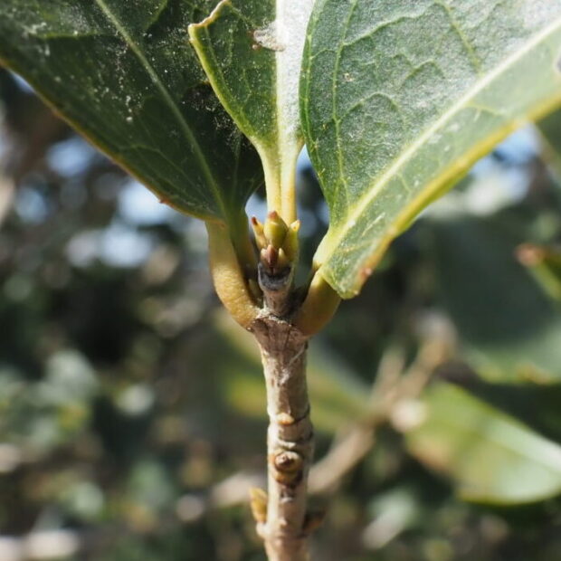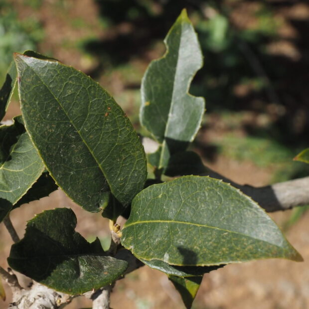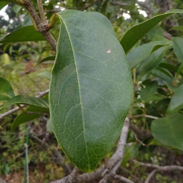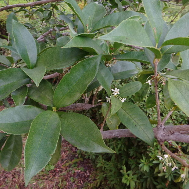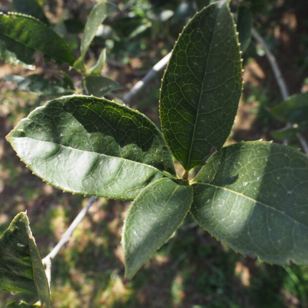 キンモクセイより幅が広い葉っぱで、 革のような質感があります。 キンモクセイと異なって、 するどいギザギザがあるので、 触るとちょっと痛いです。