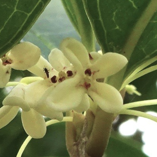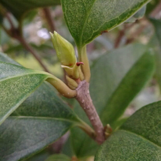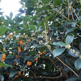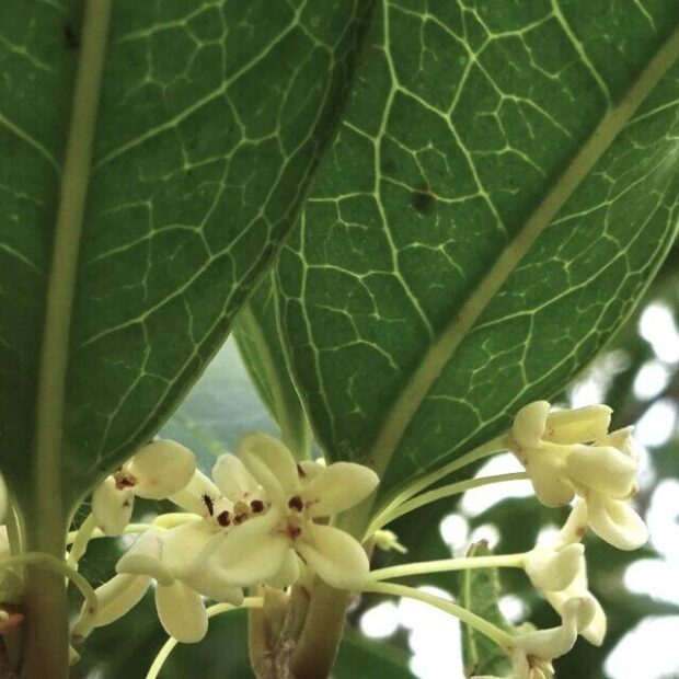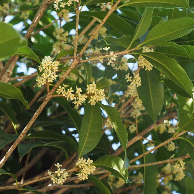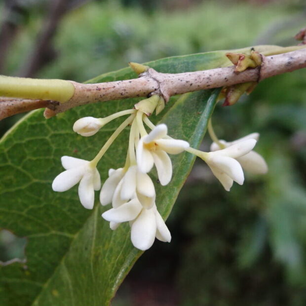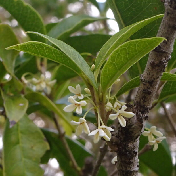 9~10月、 葉の付け根に白くてキンモクセイとそっくりの形や香りの花を咲かせます。 花付きや花の香りがキンモクセイより少ないため植栽されることが少ないです。 日本で植えられている木は雄花だけが咲く雄木がほとんどで、 雌花(めばな)はめったに見られません。