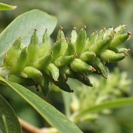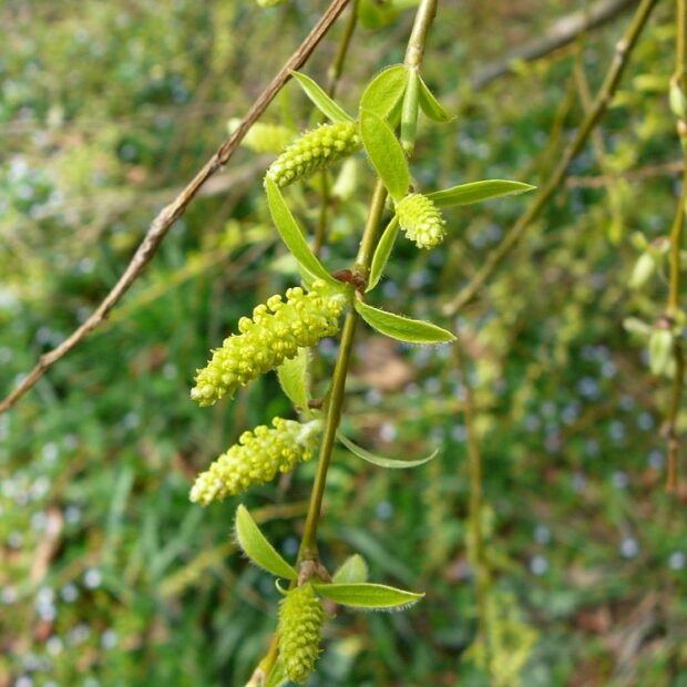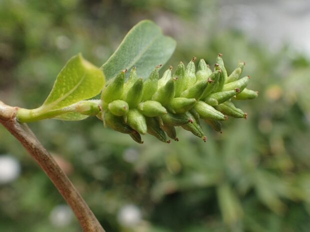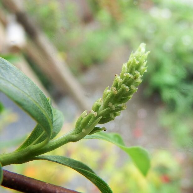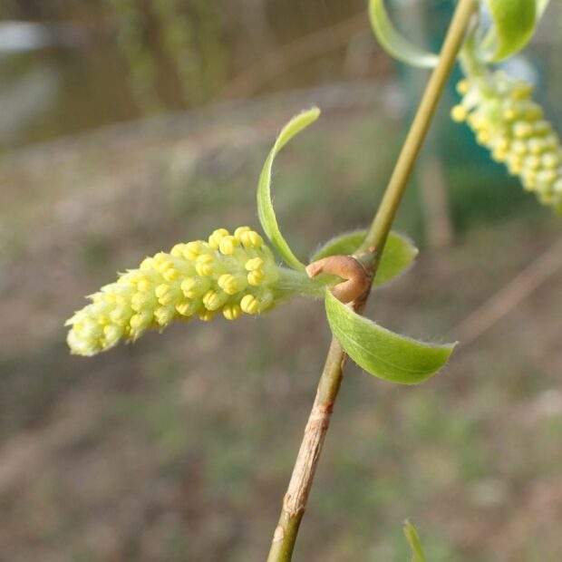 3~4月頃に咲きます。 雌雄別株(おすの木とめすの木がある)で、 雄花は長さ2㎝程で黄緑色の円柱状です。