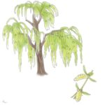 シダレヤナギという名前は、 枝が垂れる(=枝垂れ(しだれ))性質によると言われています。 「ヤナギ」については、 矢の材料とした「矢の木」が転じたと新井白石は記していますが、 少なくともシダレヤナギの細い枝で矢を作るのは難しいと考えられます。